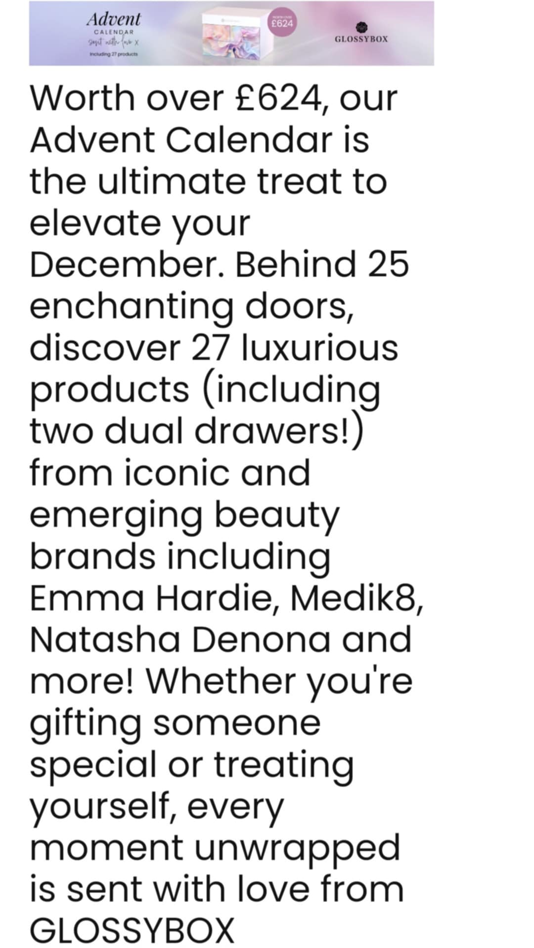 The Glossybox Advent Calendar is the ultimate treat to elevate your December. Behind 25 enchanting doors, discover 27 luxurious products (including two dual drawers!) from iconic and emerging beauty brands including Emma Hardie, Medik8, Natasha Denona and more! Whether you're gifting someone special or treating yourself, every moment unwrapped is sent with love from GLOSSYBOX